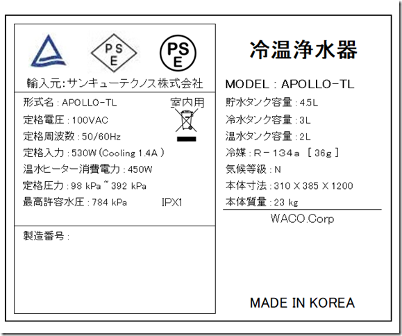 PSE Certificate, Hot & Cold Water Dispenser(INFINITE-L40, INFINITE-20, INFINITE-20S)